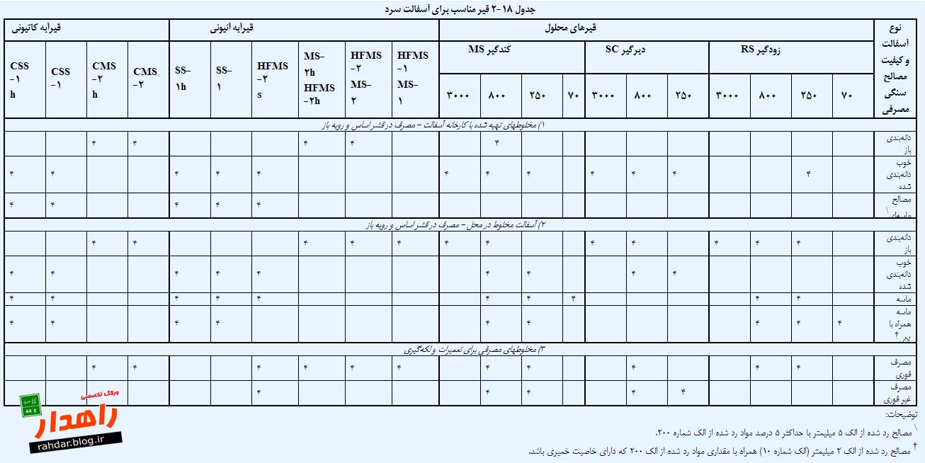 جدول 18-2 با توجه به عوامل ذکر شده به عنوان راهنما، برای انتخاب قیرهای محلول و قیرآبهها میتواند به کار گرفته شود. در انتخاب قیر علاوه بر جدول راهنما، به موردهای زیر توجه خاص مبذول میشود:
